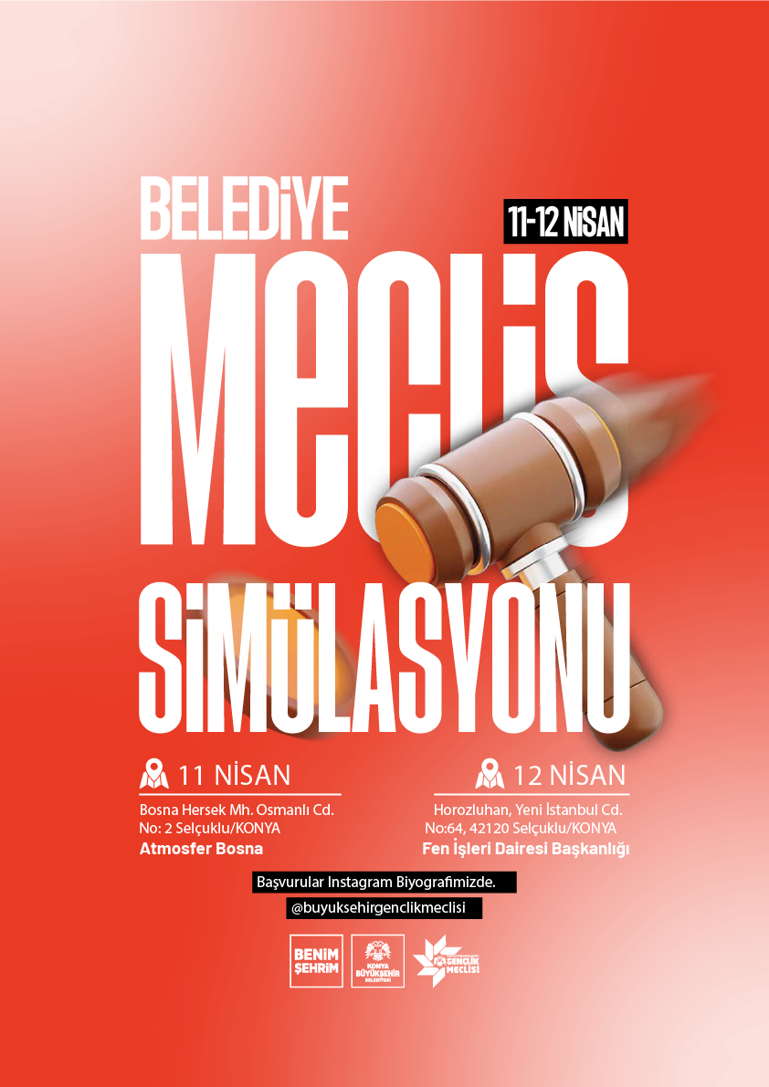 Konya Büyükşehir Belediyesi Gençlik Meclisi tarafından organize edilen Meclis Simülasyonu Etkinliği; Gençlerin yerel yönetim süreçlerini tanıması, müzakere kültürünü geliştirmesi ve şehir yönetimine dair farkındalık kazanması amacıyla oluşturulmuş bir simülasyon etkinliğidir.