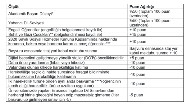 1- The ranking of Erasmus study and internship mobility applications is evaluated based on the “Selection Criteria and Scoring Table.”