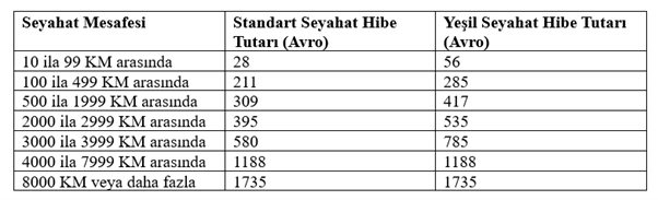 To help cover students’ travel expenses, the distance between the starting point of the mobility and the location where the activity takes place must be determined using the distance calculator provided by the European Commission, and the travel grant must be calculated using the table below. The distance in kilometers shown by the distance calculator corresponds to the round-trip grant amount in the table below; this amount is not multiplied by two.