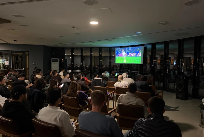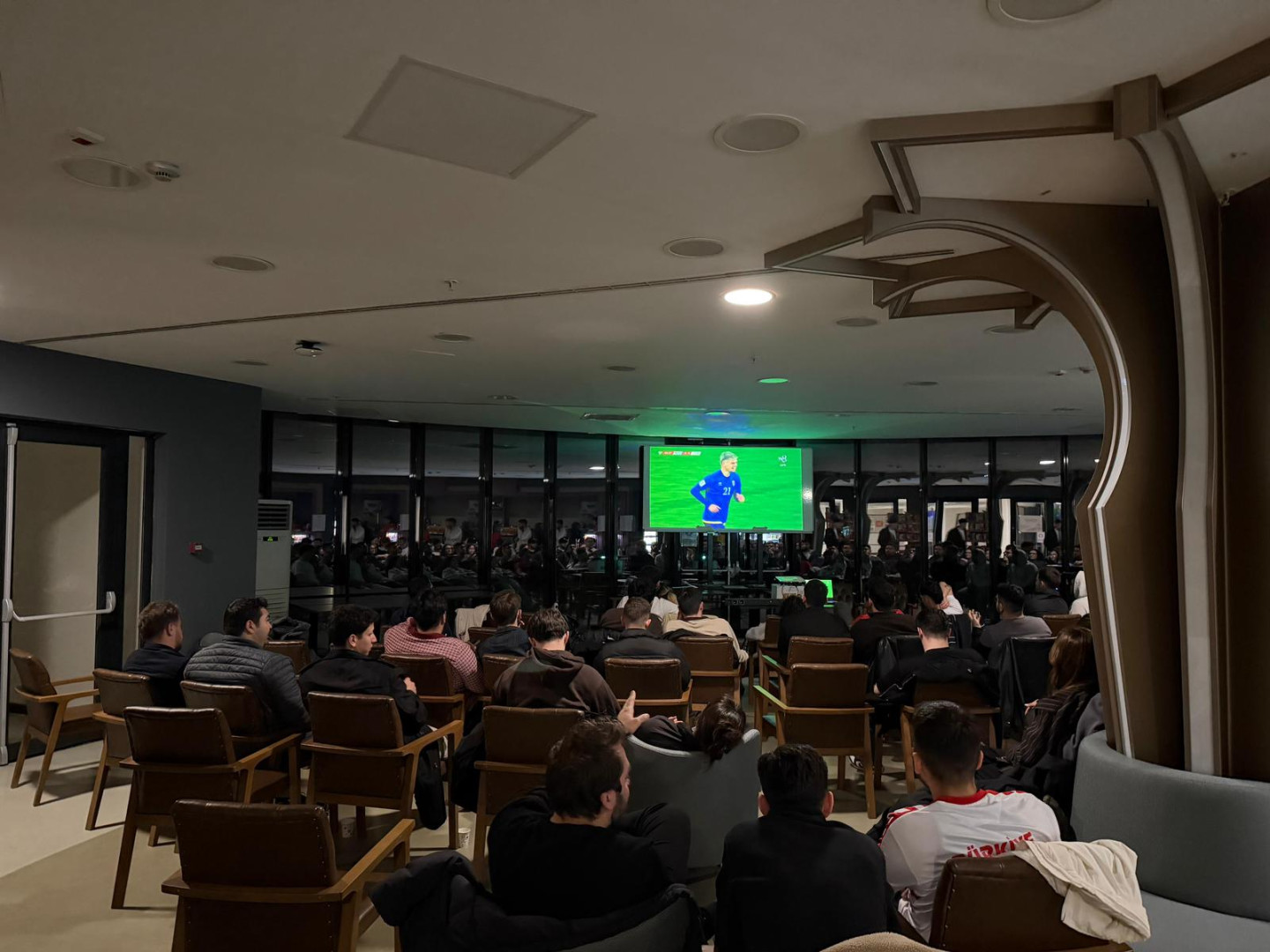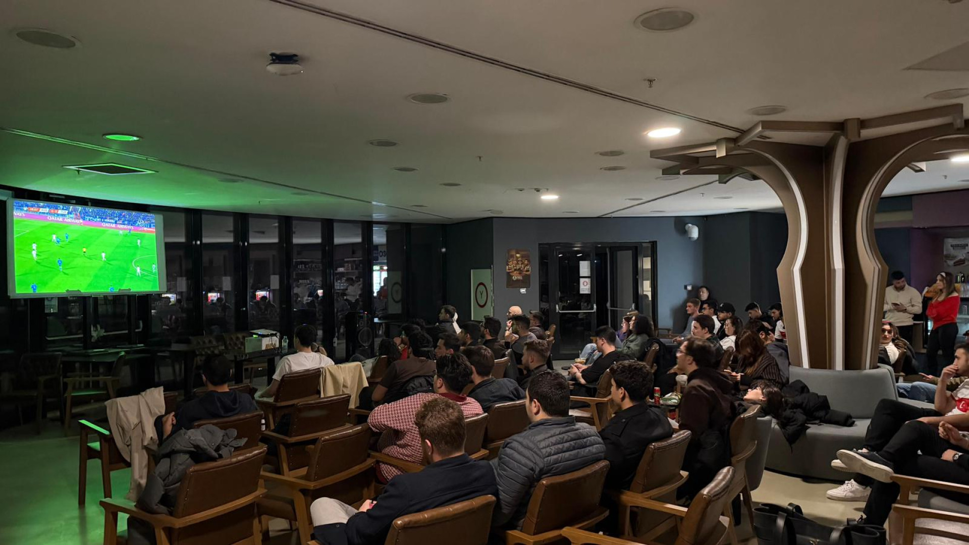 Last night’s national team match was met with great enthusiasm thanks to a special event organized by our university. Our students gathered at Neo Café—one of our campus’s social hubs—to watch the match on the screen set up there, cheering on our national team with Turkish flags in hand.