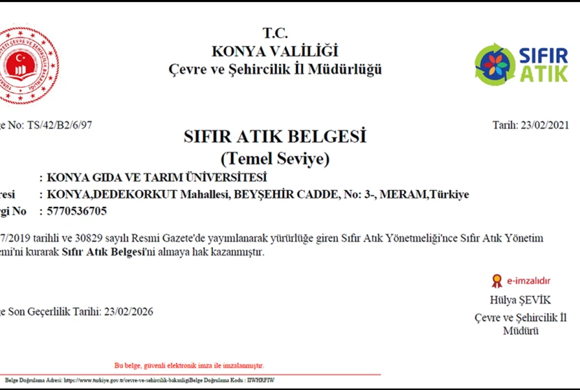 Çevre ve Şehircilik Bakanlığı tarafından 12/07/2019 tarihli ve 30829 sayılı Resmi Gazete'de yayımlanarak yürürlüğe giren Sıfır Atık Yönetmeliği kapsamında “Sıfır Atık Yönetim Sistemi” ni kuran üniversitemiz Sıfır Atık Belgesi'ni almaya hak kazanmıştır. Bu kapsamda üniversitemize Konya Valiliği Çevre ve Şehircilik İl Müdürlüğü tarafından düzenlenen Sıfır Atık Belgesi verilmiştir.