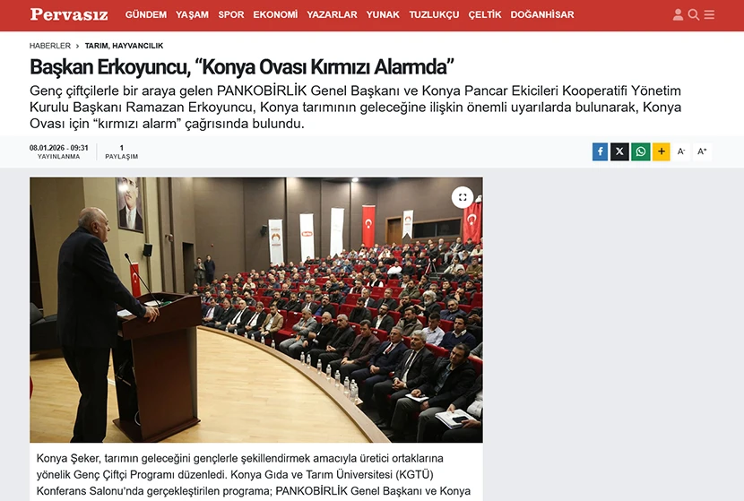 PANKOBİRLİK Genel Başkanı ve Konya Pancar Ekicileri Kooperatifi Yönetim Kurulu Başkanı Ramazan Erkoyuncu, genç çiftçilerin tarımın geleceği açısından büyük önem taşıdığını vurgularken üretimde verimliliğin artırılması, bilgi ve teknolojinin sahaya yansıtılması adına bu tür programlara devam edeceklerini aktardı. Başkan Erkoyuncu konuşmasında suyun tarım için hayati öneme sahip olduğu vurgulayarak şu açıklamalarda bulundu; “Konya, tarımda ülkemizin lokomotif şehirlerinden biridir. Ancak hepimizin de bildiği üzere, su olmadan tarımın sürdürülebilirliği mümkün değildir. Ne yazık ki bugün geldiğimiz noktada su meselesi son derece vahim bir boyuta ulaşmıştır. Yapılan tüm değerlendirmelerde ve konuşmalarda, Avrupa'nın en büyük, Dünya'nın 10. büyük tarımsal ekonomisine sahip olan Türkiye tarımı, küresel ölçekte de hissedilen ancak ülkemizde ve özellikle de Konya ovasında yüz yüze kaldığımız kuraklık gerçeği sebebiyle, acil eylem planlarını devreye sokmazsak tarımsal hasılamızda küçülme kaçınılmaz hale gelecek, dışa bağımlılık riski her geçen gün büyüyecektir. Bu kaygıların giderilmesi adına herkesin samimi bir çaba içerisinde olduğu görülmektedir. Ancak değişmeyen bir gerçek vardır: Su meselesi birinci önceliğimizdir ve tüm dikkatimizi bu konuya yoğunlaştırmamız gerekmektedir. Tarımın önemi bugün de, yarın da sıkça vurgulanmaktadır. Ancak kanaatimizce tarımın asıl kıymeti gelecekte çok daha net bir şekilde anlaşılacaktır. Buna karşın, bugünden yarına baktığımızda çiftçimizin mevcut durumu ne yazık ki iyi değildir. Son bir-iki yıldır üreticilerimiz ciddi zorluklarla karşı karşıyadır. Bu süreçte iklim şartları ve özellikle susuzluk, en belirleyici unsurların başında gelmektedir. Konya Ovası’na su getirilmesi hayati önem taşımaktadır. Çarşamba Çayı’ndan Konya Ovası’na su aktarımı konusunda maalesef son iki yıldır tek bir damla dahi su ulaşmamıştır. Bu nedenle tarımsal üretimin neredeyse tamamı yer altı sularına dayalı olarak sürdürülmektedir. Ancak yer altı su kaynaklarımız da ciddi bir tehdit altındadır. Bugün itibarıyla kırmızı alarm durumundayız. Çiftçilerimiz için birinci önceliğimiz, su sorununun çözümü adına kararlılıkla gayret göstermektir. Bu doğrultuda hem PANKOBİRLİK hem de Konya Pancar Ekicileri Kooperatifi olarak sürecin yakın takipçisi olmaya devam ediyoruz. Şahsen ben de bu tablo karşısında büyük bir kaygı içerisindeyim. Susuzluğa dayanıklı tohumlar konusunda çeşitli değerlendirmeler yapılmaktadır. Ancak bu yaklaşımı gerçekçi bulmadığımızı ifade etmek isterim. Elbette daha az suya ihtiyaç duyan çeşitler geliştirilebilir; ancak tamamen susuz bir üretim mümkün değildir. Çünkü susuz bir hayat da mümkün değildir” dedi.