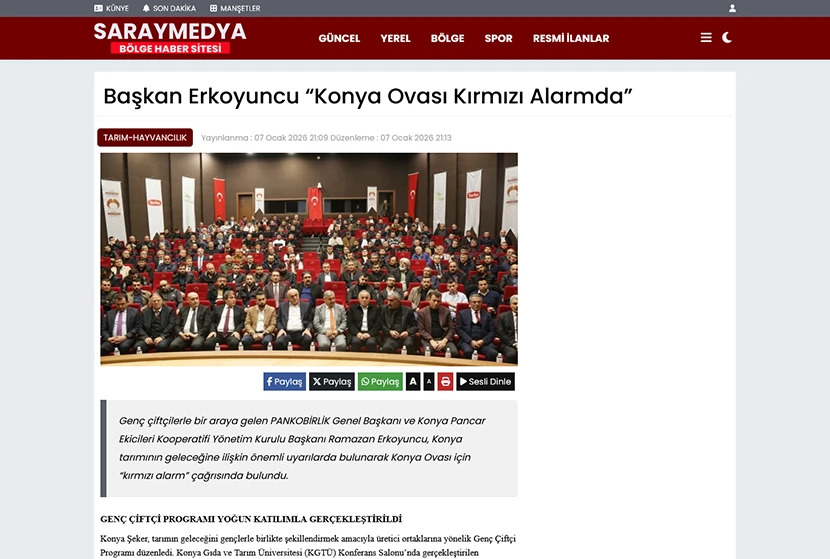 Genç çiftçilerle bir araya gelen PANKOBİRLİK Genel Başkanı ve Konya Pancar Ekicileri Kooperatifi Yönetim Kurulu Başkanı Ramazan Erkoyuncu, Konya tarımının geleceğine ilişkin önemli uyarılarda bulunarak Konya Ovası için “kırmızı alarm” çağrısında bulundu.