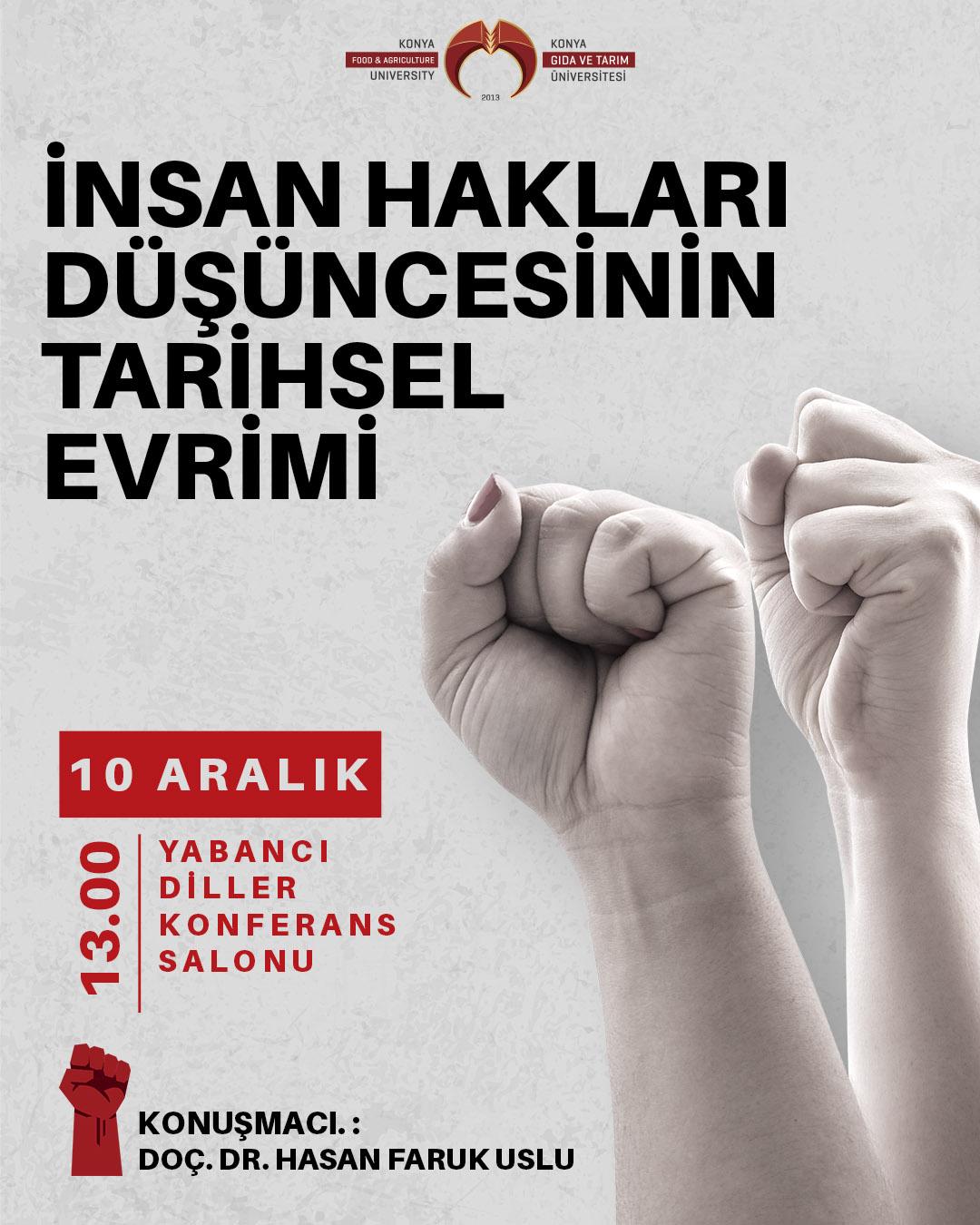 Konya Gıda ve Tarım Üniversitesi olarak, “İnsan Hakları Düşüncesinin Tarihsel Evrimi” başlıklı konferansımıza tüm öğrencilerimiz ve çalışanlarımız davetlidir.