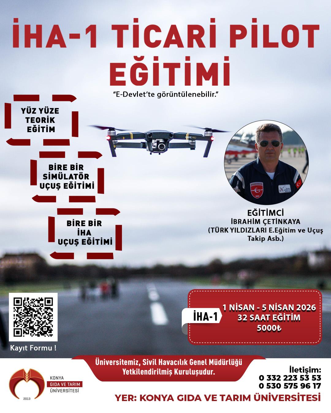 Konya Gıda ve Tarım Üniversitesi tarafından düzenlenecek olan Ticari İHA-1 Pilot Eğitimi kapsamında, kursiyerlere Sivil Havacılık Genel Müdürlüğü (SHGM) tarafından yetkilendirilen Ticari İHA Pilot Lisansı edinme fırsatı sunulmaktadır.