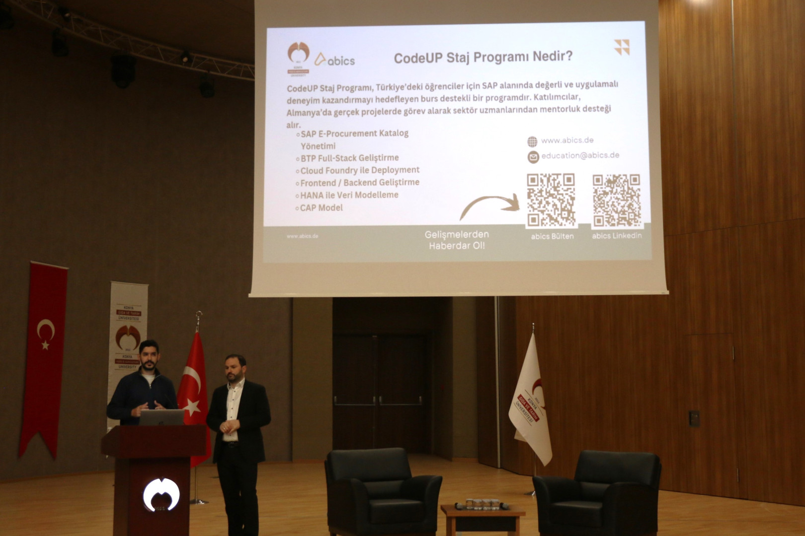 Programa SBBF Dekanı Prof.Dr. Baki Rıza BALCI, akademisyenler, öğrenciler katılım sağlamıştır. Abics GmbH firması Kurucu Ortağı Sn. Mehmet ÜNAL ve SAP Uzmanı Artun ÇELİK, Global IT Dünyasındaki İş Hayatı ve SAP Kariyer Fırsatları” hakkında bilgi paylaşımında bulunmuştur.