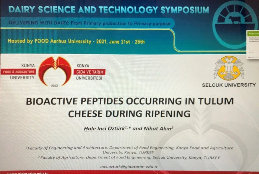 Mühendislik ve Mimarlık Fakültesi Gıda Mühendisliği Bölümü Öğretim Üyesi Dr. Öğr. Üyesi Hale İnci Öztürk, 21-25 Haziran 2021 tarihleri arasında Aarhus Üniversitesi tarafından düzenlenen “Dairy Science and Technology Symposium 2021-Delivering with dairy: from primary production to primary purpose“ konulu konferansa “Bioactive peptides occurring in Tulum cheese during ripening“ başlıklı sunumu ile katıldı.