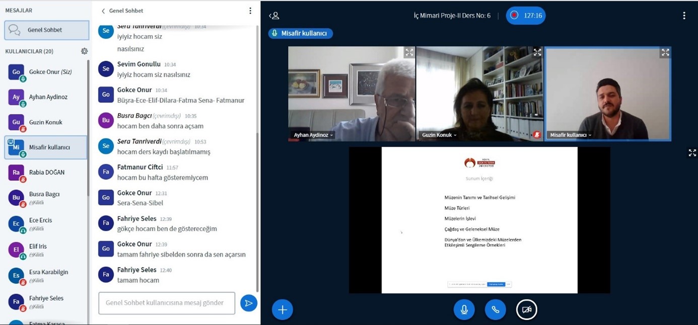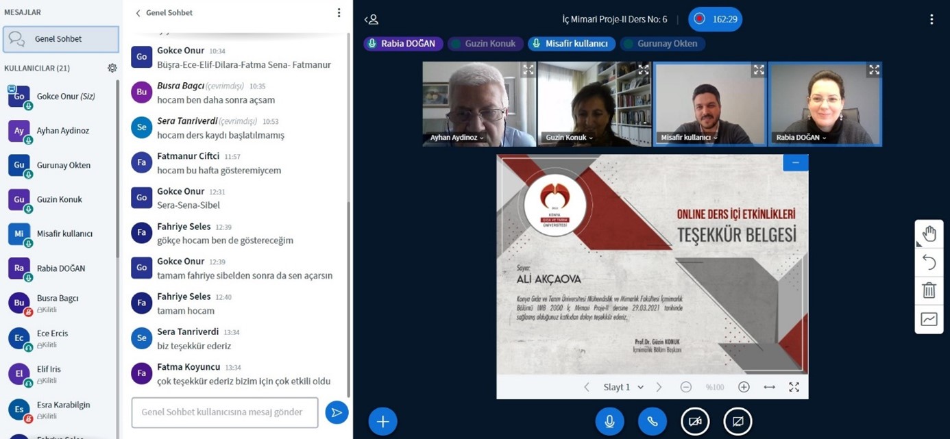 Ders içi etkinliğe ikinci sınıf öğrencilerimiz ve bölüm öğretim üyelerimiz katıldı. Seminer sonunda, İç Mimarlık Bölüm Başkanımız Prof. Dr. Güzin Konuk tarafından Arş. Gör. Ali Akçaova’ya teşekkür belgesi online olarak takdim edildi.