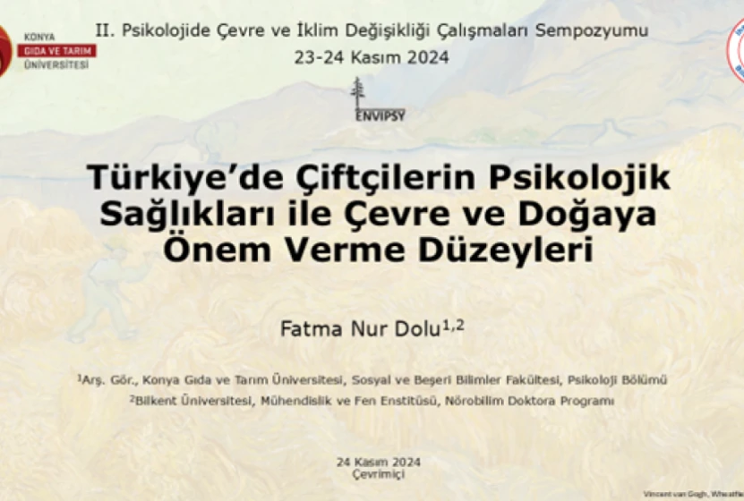Psikoloji Bölümü araştırma görevlisi Fatma Nur Dolu yürüttüğü çalışmasının bulgularını "Türkiye’de Çiftçilerin Psikolojik Sağlıkları ile Çevre ve Doğaya Önem Verme Düzeyleri" başlığı ile 23-24 Kasım tarihlerinde Çanakkale Onsekiz Mart Üniversitesi Psikoloji Bölümü bünyesinde bulunan Çevre Psikolojisi Laboratuvarı (EnviPsy -Lab) tarafından düzenlenen Psikolojide Çevre ve İklim Değişikliği Çalışmaları Sempozyumu'nda sözlü olarak sundu.