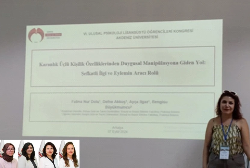 Psikoloji Bölümü öğretim görevlisi S. Bengisu Büyükmumcu ve araştırma görevlileri Ayça Ilgaz, Defne Aynur Akkuş ve Fatma Nur Dolu birlikte yürüttükleri çalışmanın bulgularını “Karanlık Üçlü Kişilik Özelliklerinden Duygusal Manipülasyona Giden Yol: Şefkatli İlgi ve Eylemin Aracı Rolü” başlığı ile 05-07 Eylül tarihlerinde Akdeniz Üniversitesi’nde düzenlenen Ulusal Psikoloji Lisansüstü Öğrencileri Kongresi’nde sözlü olarak sundu.