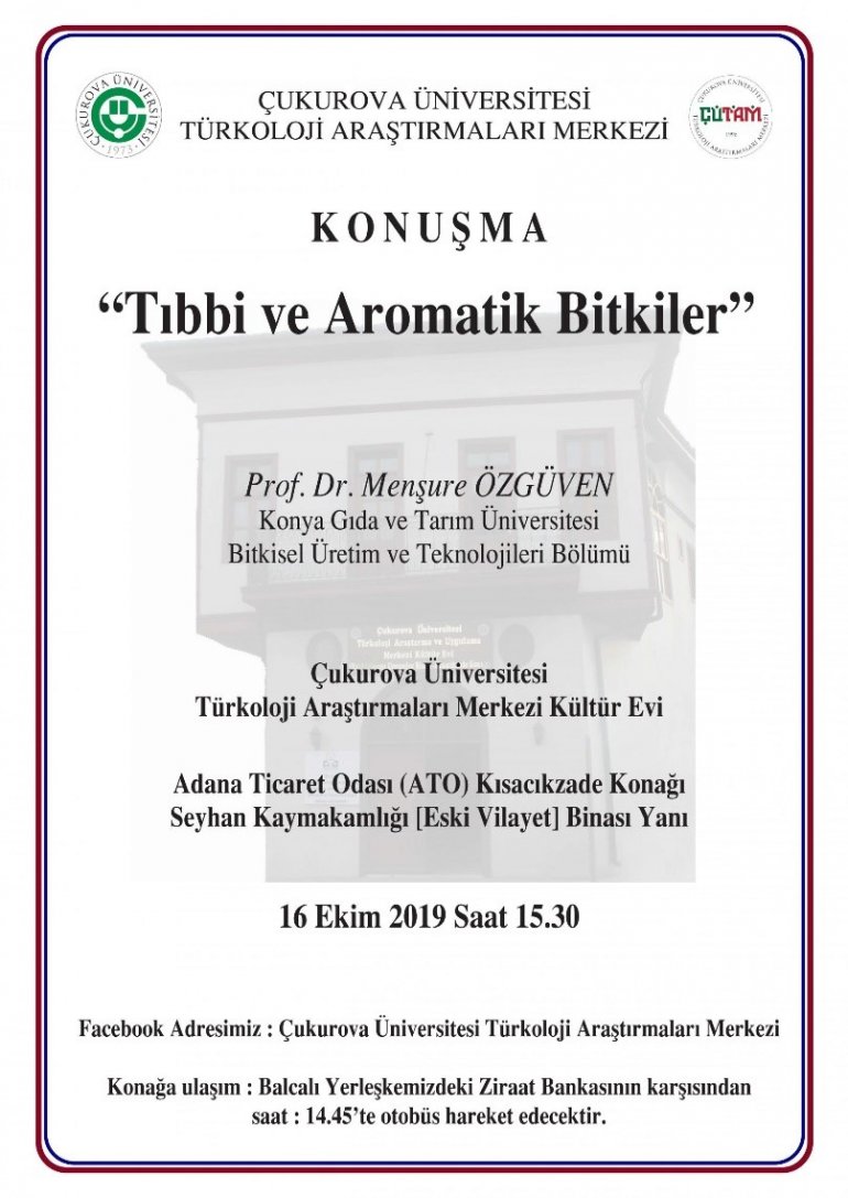 Tarım ve Doğa Bilimleri Fakültesi Bitkisel Üretim ve Teknoloji Bölümü öğretim üyemiz Prof. Dr. Menşure Özgüven, Çukurova Üniversitesi Türkoloji Araştırmaları Merkezinin (ÇÜTAM) daveti üzerine Merkezin Kültür Evi'nde "Tıbbi ve Aromatik Bitkiler" konulu bir konferans vermiştir.